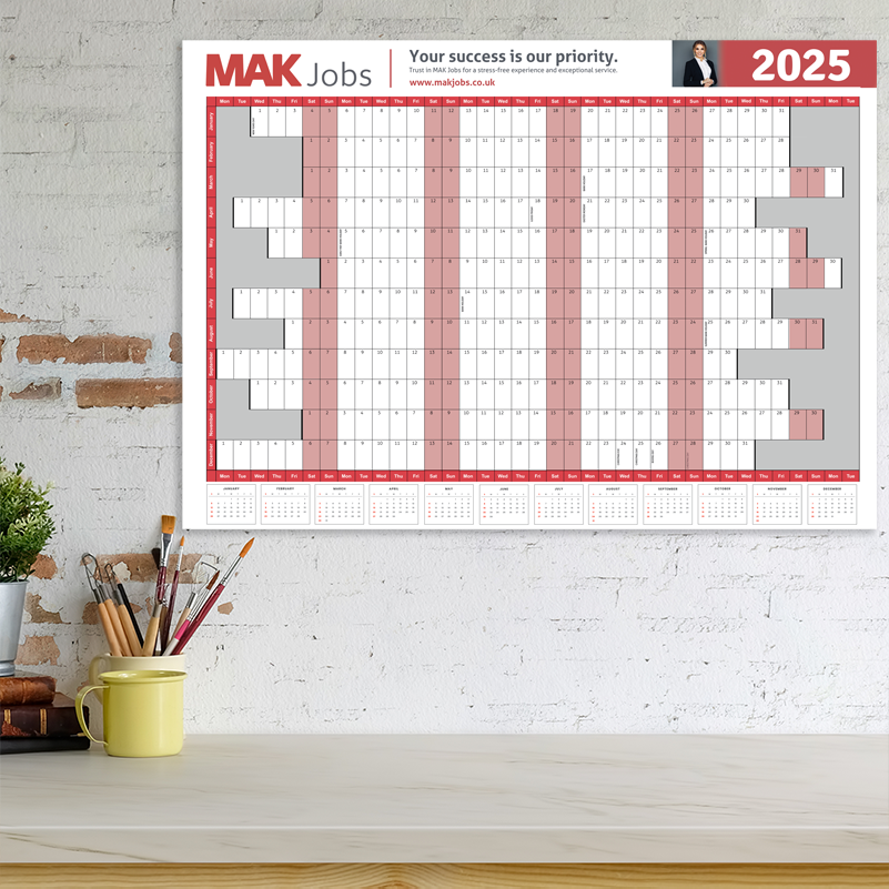 The most popular formats for businesses are wall calendars (typically A3 or A4, wiro bound, great for visual branding) and desktop calendar printing (A5 or A6 tent-style, ideal for office desks and constant visibility). Wall planners (A2/A1) are also a great option for team-based businesses.